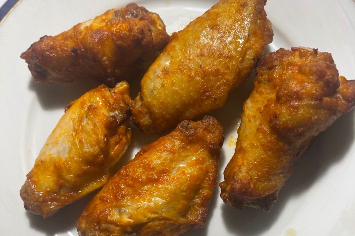 Heat fully cooked wings to an internal temperature of 140-145°F.