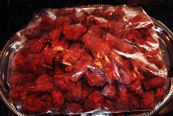 These lightly breaded boneless chicken breast chunks are coated with hot sauce. The same level of heat  you would associate with an order of hot wings at a restaurant. Great snack or party food. Serve with Blue Cheese or Ranch dressing.